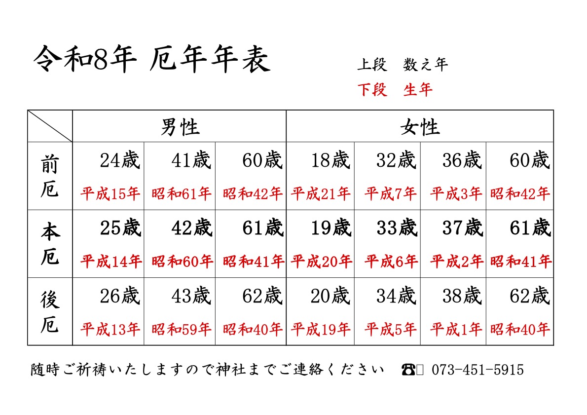 令和八年 厄除年表 2025.12.29 Tweet Share Hatena Pocket RSS feedly Pin it 初詣 授与所のご案内 新着記事 お知らせ一覧 2025.12.29 初詣 授与所のご案内 2025.11.18 八幡台小学校より訪問